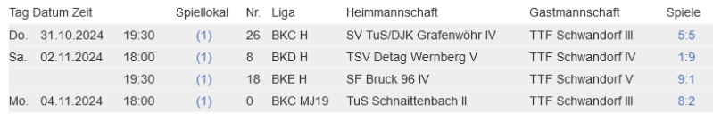 Die Bilanz des Wochenendes lautet 3 Siege, 1 Unentschieden und 4 Niederlagen. Besonders hervor zu heben sind die Herren 3 die zweimal 6:4 gewannen. Beim Spiel gegen Wernberg legten beide Doppel den Grundstein für den Erfolg. Weiterhin erfolgreich waren Andreas Gietl, Katja Götz und Gudrun Brunner-Deml (2x). Auch beim zweiten Spiel gegen Nabburg konnte man die Doppelstärke mit 2 Siegen ausspielen. In den Einzeln punkteten hier Andreas Gietl (2x), Thomas Spindler und Andor Sveller. Mit diesen beiden Erfolgen ging es auf Platz 4 in der Bezirksklasse B mit 9:7 Punkten.