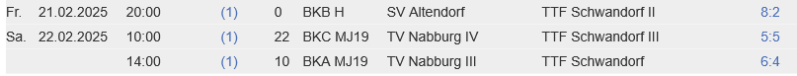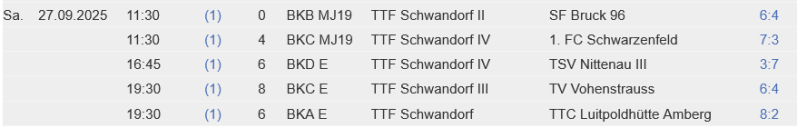 Die Jugend 1 holte gegen den TV Nabburg einen nicht mehr geglaubten Punkt, den Moritz Dirmeier in der letzten Partie gegen die Nr.1 des Gegners sicher stellte. Die weiteren Punkte holten Noel Grabinger und Sophie Schenk 3x. Die Jugend 3 war beim 5:5 gegen die SF Bruck auch erfolgreich. Lara Wltschek/Marvin Wohlrab im Doppel, sowie Lara Wltschek 2x, Luca Spiegler und Finn Spudic holten die Punkte.