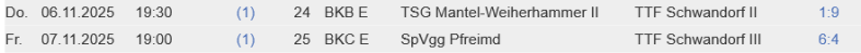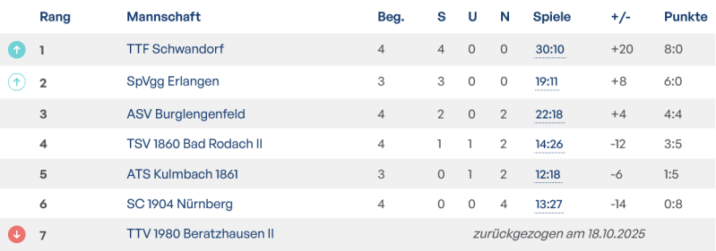 Mit nun 8:0 Punkten führt man weiterhin die Tabelle der Verbandsliga Nordost an. Das nächste Heimspiel gegen die bisher auch noch ungeschlagene Spielvereinigung Erlangen am 23.11.25 wird die Entscheidung über die Herbstmeisterschaft bringen.