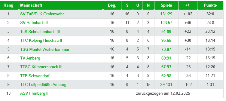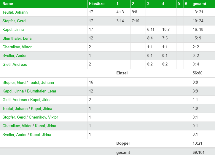 Die Herren 1 konnten in 12 von 17 Spielen komplett antreten und dies wirkte sich natürlich nicht nur auf den Mannschaftsgeist aus, sondern auch auf die Leistungen am Tisch. Mit 11:21 Punkten belegte man Platz 8 in der Bezirksklasse A West und man sicherte sich bereits in der Vorrunde den Klassenerhalt. Die Bilanzen der Stammspieler sind Johann Teufel 13:21, Gerd Stopfer 10:24, Jirina Kapoll 16:18 und Lena Blumenthaler 15:9. In den Doppeln erreichten Johann Teufel und Gerd Stopfer 8:8 Siege. So wird man nächstes Jahr versuchen in gleicher Aufstellung noch ein bisschen mehr zu erreichen.