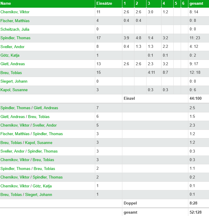 Die Herren 2 hatten in der Bezirksklasse B eine sehr schwierige Saison, die man mit schwankenden Leistungen mit 5:31 Punkten auf dem Abstiegsplatz 10 beendete. Die Stammspieler erspielten folgende Bilanzen: Viktor Chernikov 8:14, Thomas Spindler 11:23, Andor Sveller 4:12, Andreas Giebel 9:17 und Tobias Bräu 12:18.
