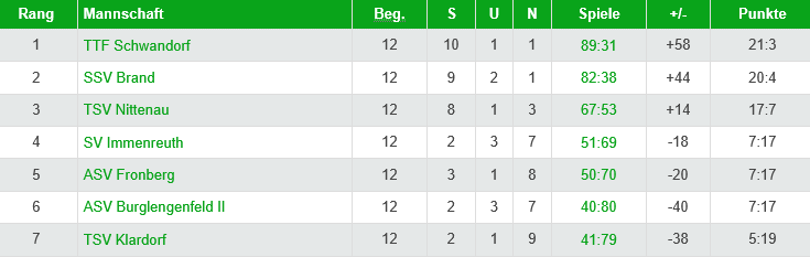 Das Erfolgsteam und Aushängeschild des Vereins sind die Damen. Mit 21:3 Punkten beherrschte man die Liga und wurde Meister der Bezirksoberliga. Damit hat man das Aufstiegsrecht in die Verbandsliga. Die Stammspielerinnen haben alle Super-Bilanzen: Jirina Kapol 28:2, Lena Blumenthaler 9:0, Julia Scheitzach 7:5, Katja Götz 7:4, Susanne Kapol 22:4 und Gudrun Brunner-Deml 8:9.