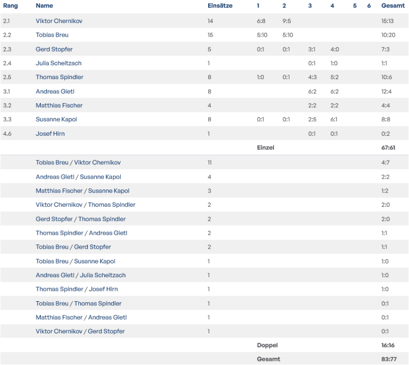 Die Herren 2 sind eigentlich als letztjährige Herren 3 als Aufsteiger in die Saison gestartet. Man konnte die eigenen Stärken an die Tische bringen und einen sehr guten Platz 4 bei 16:16 Punkten erreichen. Die acht eingesetzten Stammspieler konnten allesamt mit starken Leistungen überzeugen. Viktor Chernikov 15:13, Tobias Breu 10:20, Gerd Stopfer 7:3, Julia Scheitzach 1:1, Thomas Spindler 10:6, Andreas Gietl 12:4, Matthias Fischer 4:4, Susanne Kapol 8:8 und Josef Hirn 0:2.